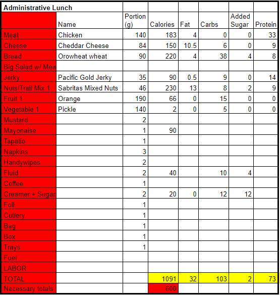 Here is an example of the nutritional information for the contents of a sample administrative lunch.
