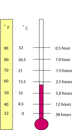 It can be seen on the graph that at 32° F (0° C) bacteria needs as much as 38 hours to divide in two. That also means that if our piece of meat had a certain amount of bacteria on its surface, after 38 hours of lying in a refrigerator the amount of bacteria will double. If we move this meat from the refrigerator to a room having a temperature of 80° F (26.5° C), the bacteria will divide every hour (12 times faster). At 90° F they will be dividing every 30 minutes. Someone might say: why do I have to bother with all this bacteria stuff, I am going to kill them anyhow. Well, this is not entirely true, as thermophillic bacteria can survive high temperatures and might spoil the food if certain procedures are not observed. Secondly, if we let spoilage bacteria multiply, for example keeping meat at room temperature for too long, they will spoil the food. The food may not exhibit odor or slime yet, but its flavor is already affected. A thermal process will kill them but the fact remains that they have already done some damage.